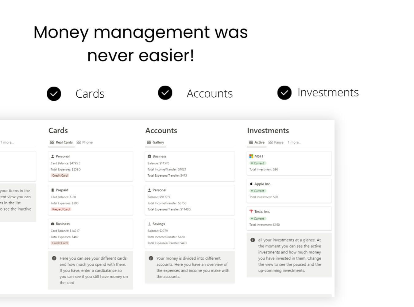 Everything you need to do around money in an all-inclusive dashboard that can be customized to your needs